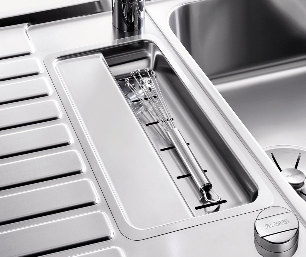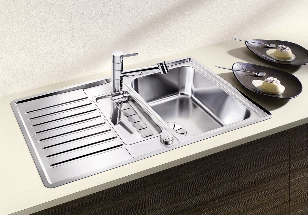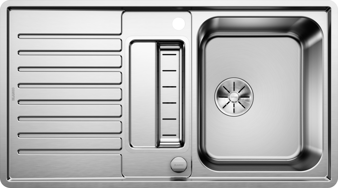 Model Blanco Classic Pro 5 S IF patrí medzi nerezové drezy s integrovaným odkvapom, ktoré zjednodušujú prácu pri dreze – mokré riady, opláchnutú zeleninu či hrnce máte kde bezpečne položiť bez zbytočného kvapkania na pracovnú dosku. Povrch hodvábny lesk je v praxi príjemný na dotyk a pri bežnom používaní pôsobí upravene; drobné stopy po vode či odtlačky sa spravidla dajú jednoducho zotrieť.