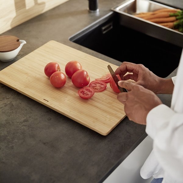 Doska je vyrobená z bambusového dreva, ktoré je ľahké, pevné a príjemné na dotyk. V kuchyni sa to prejaví pohodlnou manipuláciou a prirodzeným vzhľadom, ktorý sa ľahko kombinuje s rôznymi materiálmi – od nerezu až po kompozitné blanco drezy.