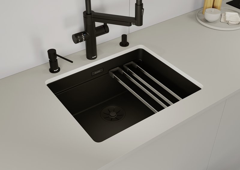 Na výber sú farebné varianty Čierna, Antracit, Biela, Biela soft, Káva, Sivá skala, Sivá vulkán, Tartufo, vďaka čomu sa dá drez prirodzene zladiť s pracovnou doskou aj spotrebičmi – od kontrastných tmavých kuchýň až po svetlé, minimalistické zostavy. Keďže ide o blanco drez s podmontovaním, výsledok pôsobí vizuálne čisto a pracovná doska zostáva dominantným prvkom.