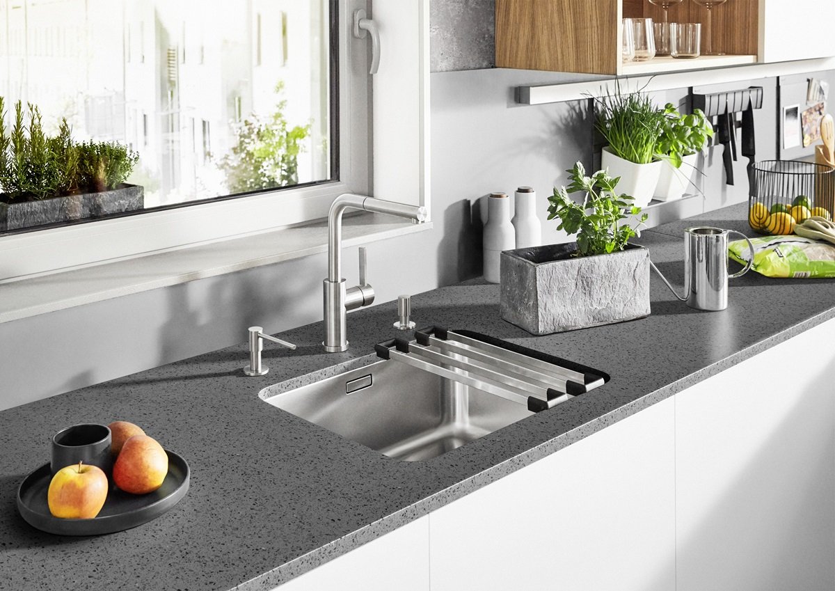 Montáž pod pracovnú dosku (undermount) umožňuje pohodlné zotieranie nečistôt priamo z pracovnej dosky do drezu bez zachytávania na okraji. Zároveň však vyžaduje vhodný typ pracovnej dosky a presný výrez – odporúča sa overiť kompatibilitu s materiálom dosky a spôsobom kotvenia.