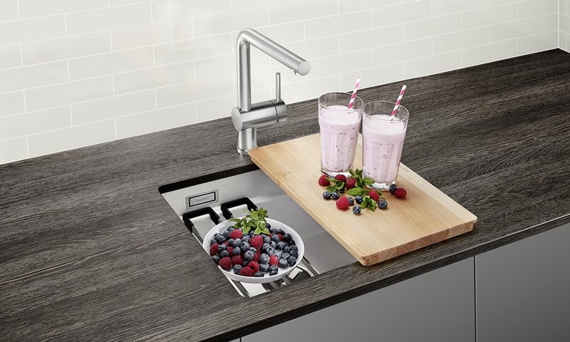 Doska je navrhnutá pre Blanco drez SUBLINE s konceptom ETAGON – ukladá sa na vnútorné stupne/lišty v dreze, vďaka čomu drží v správnej polohe a nešmýka sa po okrajoch. V praxi to znamená pohodlné krájanie „nad drezom“: omrvinky, šťava či zvyšky jedla padajú priamo do vaničky a pracovná doska na linke ostáva čistejšia.