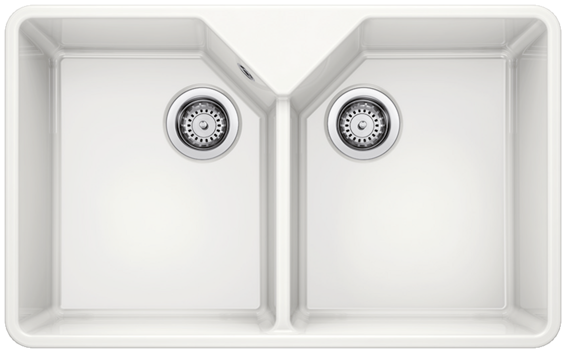 Blanco Villae Farmhouse Double keramický drez (krištáľovo biela) je dvojdrez určený do kuchýň, kde sa často varí a umýva väčšie množstvo riadu. Keramický povrch pôsobí čisto a nadčasovo a zároveň je praktický na každodennú údržbu. Vďaka dvom rovnako veľkým vaničkám sa dá pohodlne rozdeliť práca – napríklad umývanie a oplachovanie, alebo príprava surovín a odkladanie riadu.