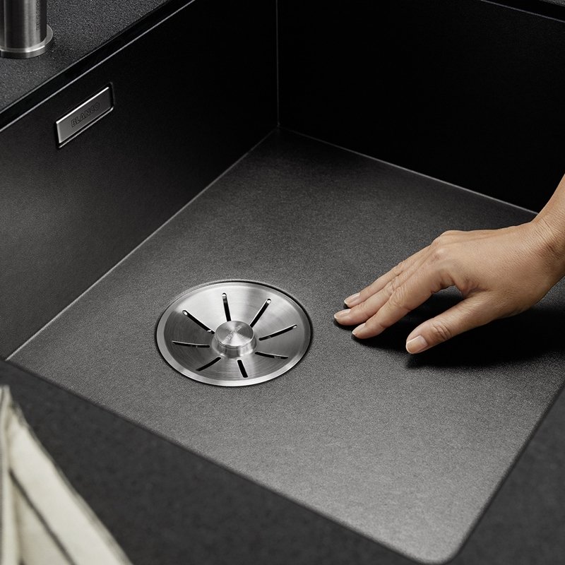 Tento drez Blanco je navrhnutý na podmontáž (U), teda uchytenie zo spodnej strany pracovnej dosky. V praxi to znamená jednoduchšie zotieranie vody a nečistôt priamo do vaničky bez zachytávania na okraji drezu; podmienkou je vhodný materiál dosky (typicky kameň, kompozit alebo kvalitne opracovaný masív).